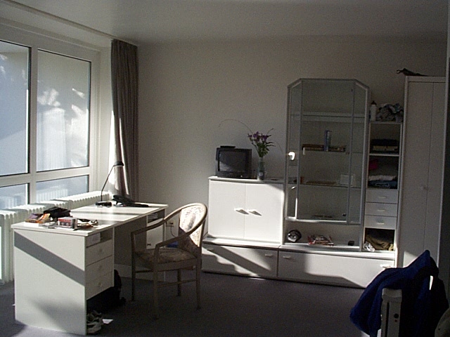 far wall is a unit that serves as storage for all our clothes and books as well as holding